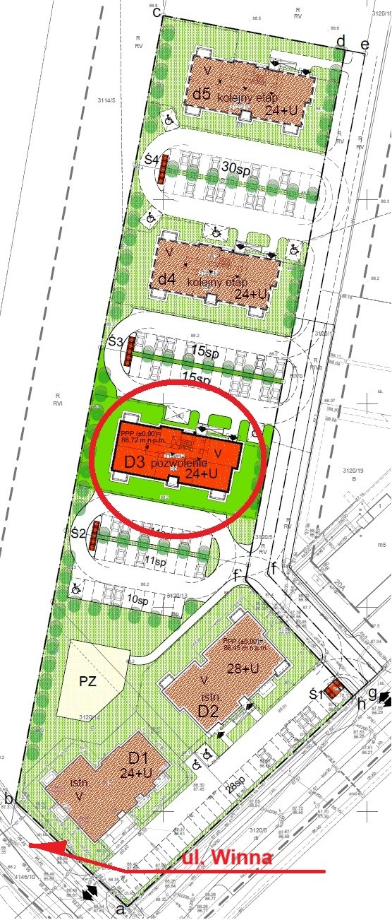 Budynek D3 przy ulicy Winnej 22C – z jedną klatką schodową wyposażoną w dźwig osobowy – pięć kondygnacji mieszkalnych oraz nadbudówka ponad dachem z pomieszczeniami technicznymi.